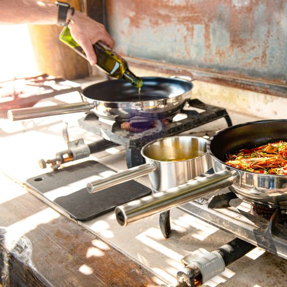 Pro dosažení optimálních výsledků a zabránění přilnutí jídla k povrchu pánve stačí použít malé množství másla nebo oleje. Doporučujeme vyhnout se použití nepřilnavých sprejů nebo extra panenských olivových olejů, které mohou zanechat rezidua na povrchu pánve a potenciálně ji poškodit. Při vaření preferujte nádobí z dřeva, silikonu nebo plastu. Vynikající volbou jsou nylonové lžíce a stěrky.