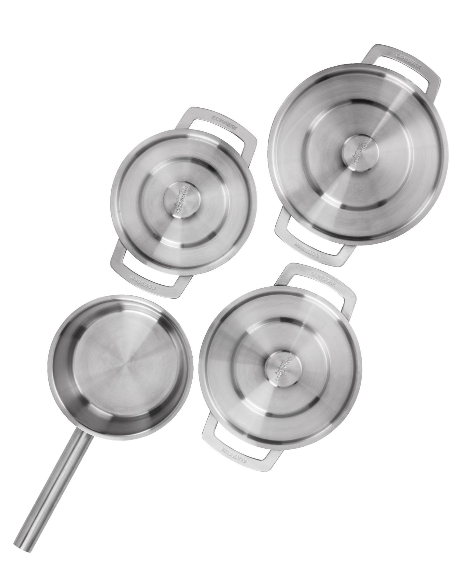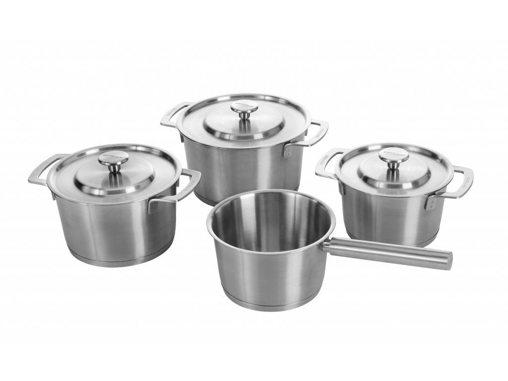 Sada čtyř hrnců vysoce kvalitního provedení, vyrobená z čistě recyklované nerezové oceli. Optimalizované pro vaše denní vaření – od zeleniny přes vajíčka až po těstoviny. Vhodné na všechny druhy varných desek, včetně indukčních, a dokonce i pro pečení. Tato sada zastane práci všech vašich hrnců. Každý hrnec má nejen elegantní design, ale je i mimořádně trvanlivý díky 4,5 mm stěnám a 6 mm dnem.