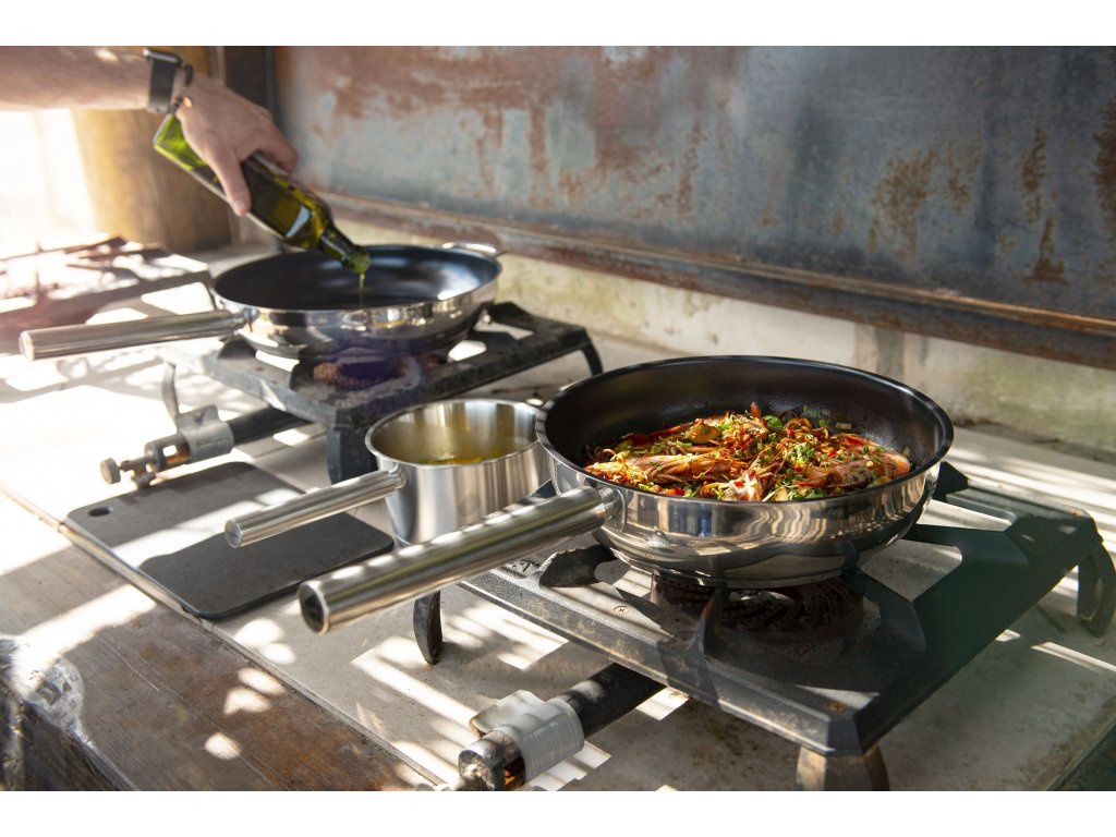 Kromě své estetické stránky také disponuje robustní odolností díky 4,5 mm oceli (dno je tlusté 6 mm). Pozor, poklice není zahrnuta v balení, avšak můžete využít poklici z hrnce o průměru 16 cm.