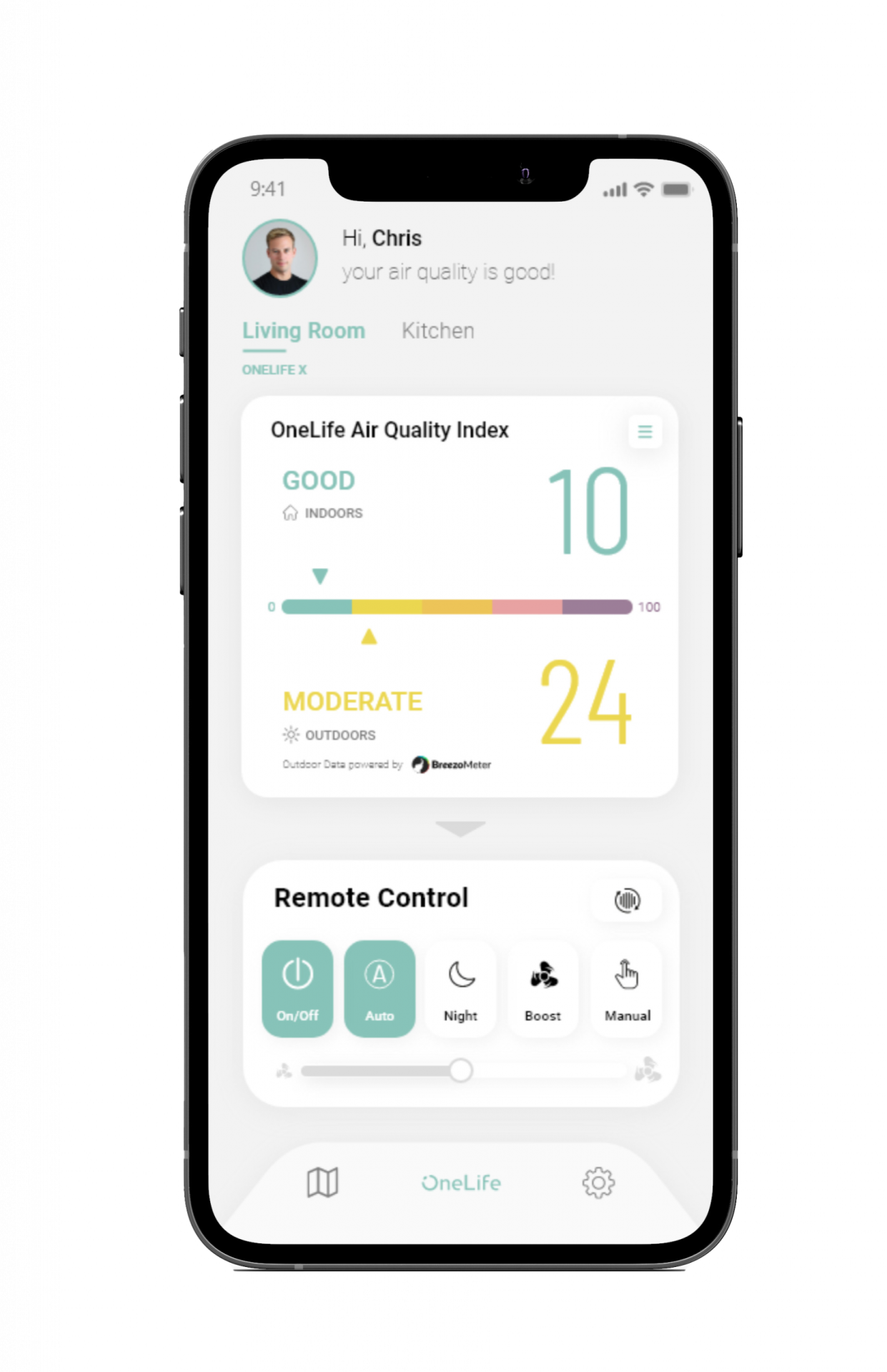 Aplikace OneLife X vám umožňuje sledovat kvalitu vzduchu u vás doma i venku, takže kdykoliv a kdekoliv můžete ovládat přísun čistého vzduchu.