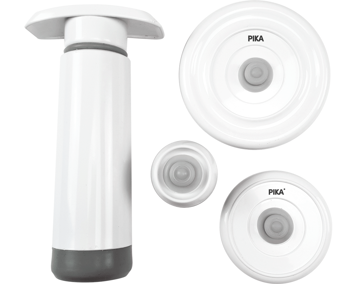 Tato úvodní sada pro vakuovou konzervaci potravin zahrnuje ruční vakuovou pumpu PIKA, kompatibilní se všemi dalšími součástmi této sady. Je ideální pro začátek vakuování v různých nádobách a lahvích. Sada obsahuje univerzální vakuovou poklici o průměru 6 cm a 8,2 cm, vakuovou zátku na láhev vína a samotnou ruční vakuovou pumpu.