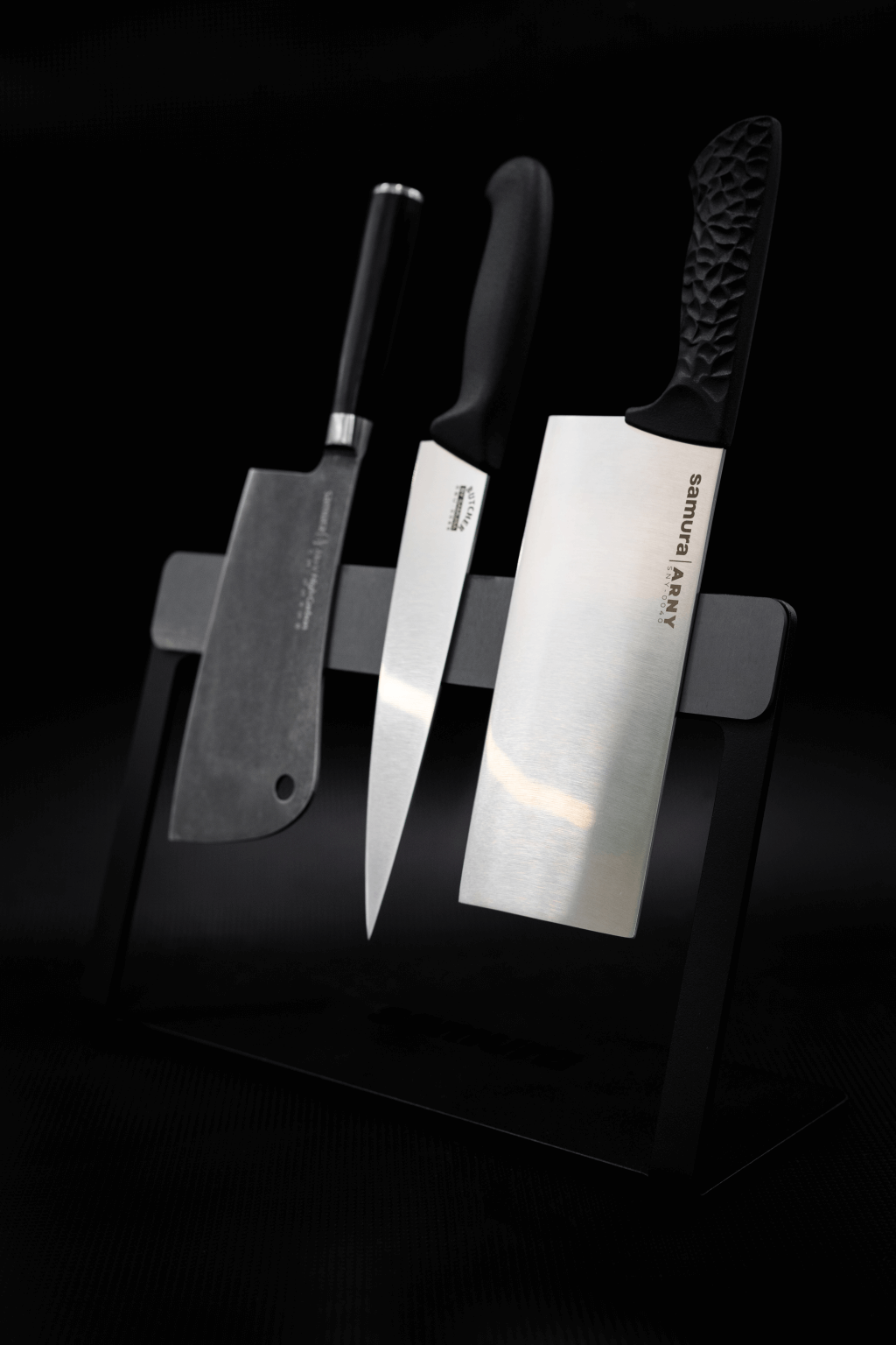 Nože značky Samura jsou vyrobený z nejlepší japonské a švédské oceli, kalené na 58 - 61 HRC. Čepele mají japonský tvar a jemné zúžení ze špičky, díky čemuž disponují fantastickým řezným výkonem. Nože Samura jsou naostřeny v úhlu 17 stupňů. To je více než u japonských nožů, ale méně než u evropských nožů. Pro rukojeť používáme nejlepší moderní materiály: Micarta, G10, stabilizované dřevo, plast s jemným povrchem, Kraton a kompozity. Vice o historii zn. Samura.