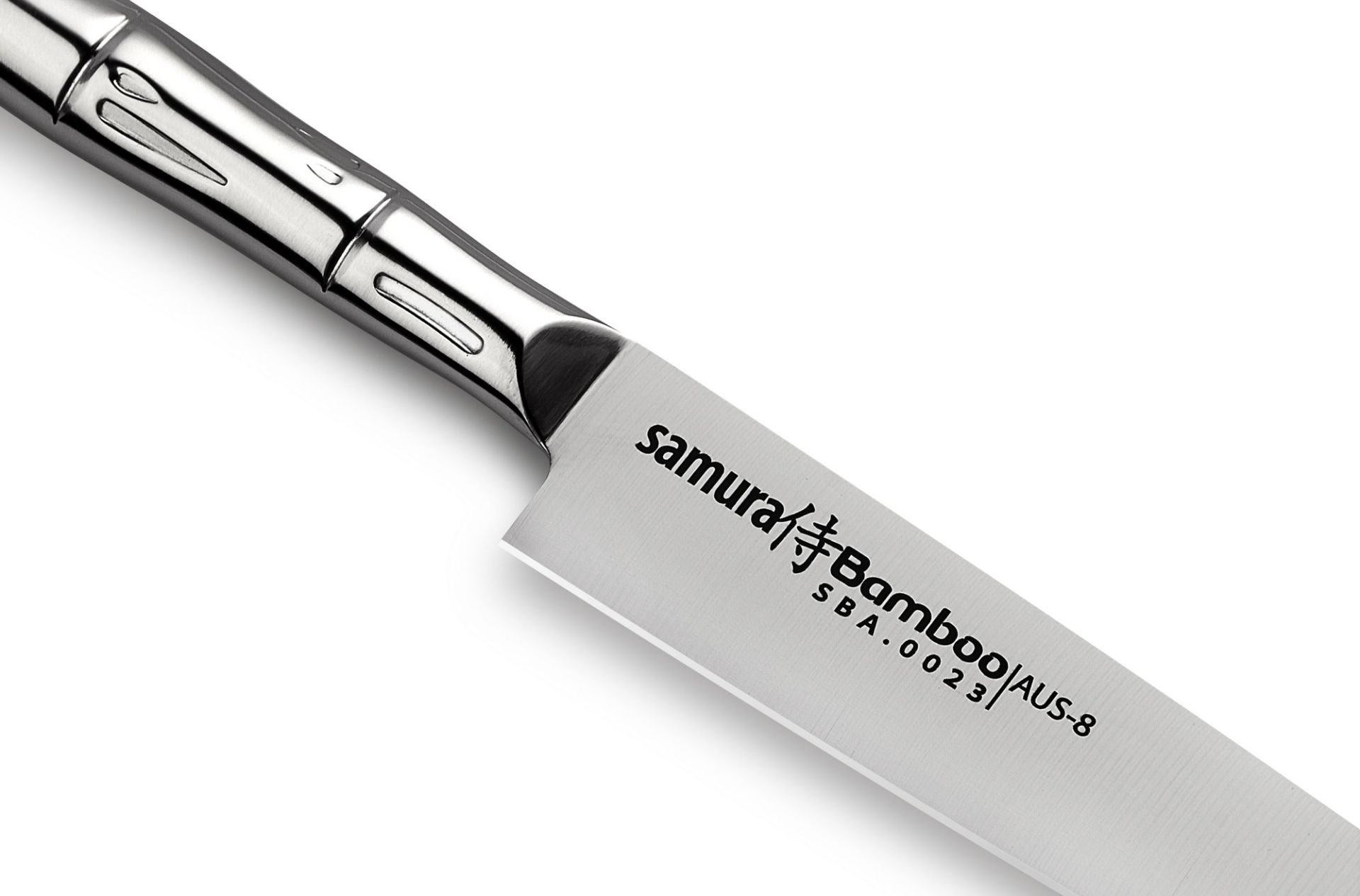 Multifunkční univerzální nůž Samura Bamboo se skvěle hodí na zpracovávání ovoce, zeleniny, různých delikates a mnoho dalších potravin. Díky jeho širokému využití patří mezi naprosto nepostradatelné nože do jakékoliv kuchyně. Tento nůž má pečlivě nastavenou délku a tvar což mu propůjčuje ideální vlastnosti pro zvládnutí mnoho různých typů potravin - od krájení chleba po připravu salátů. Tento nůž je vyroben z oceli (od čepele po rukojeť), je perfektně vyvážený a bezchybně ostrý. Nevyžaduje přílišné úsilí při krájení a svoji ostrost si zachová po dlouhou dobu.