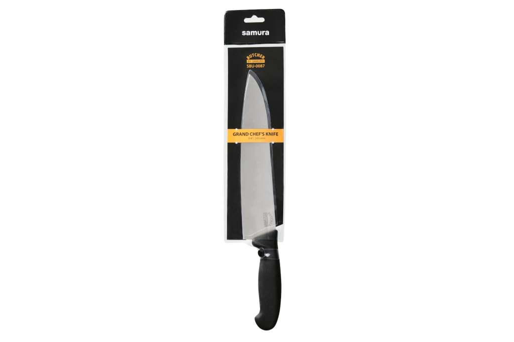 Větší a vylepšené verzi GRAND oblíbeného a hojně využívaného klasického šéfkuchařského nože jsou svěřovány ještě obtížnější kuchyňské úkoly. Čepel je ideální pro provádění nejširší škály kuchyňských prací: řezání, krájení, sekání. Nůž se širokou a dlouhou čepelí zvládne krájení i velkých kusů masa, ryb, zelí, sýrů, … Stejně jako všechny nože série Samura Butcher je i tento nůž vysoce odolný a mimořádně ostrý.