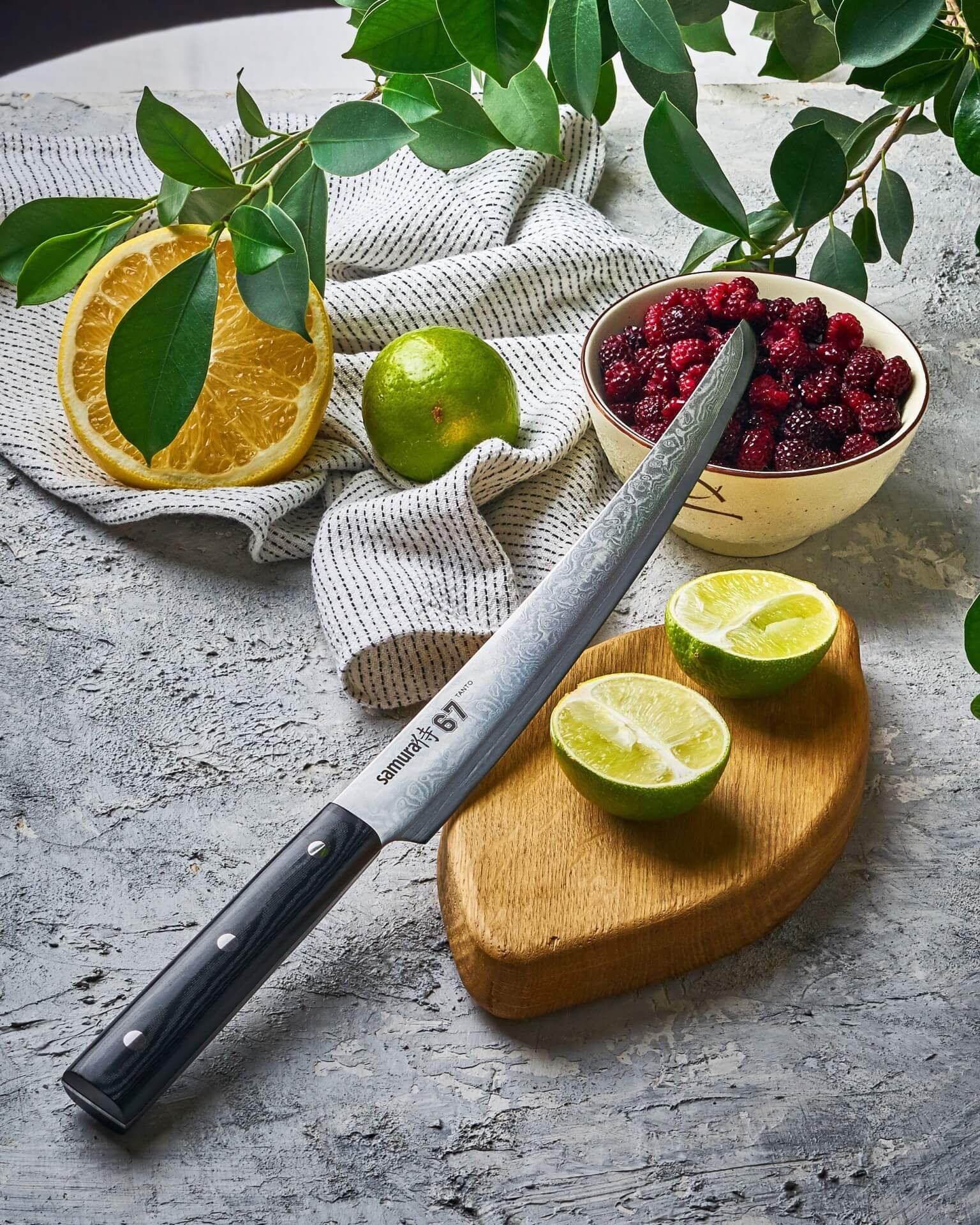 Samura Damascus 67 Nářezový nůž TANTO s délkou čepele 23 cm si vypůjčil tvar od legendárních japonských mečů „Tanto“. Tyto meče jsou v moderním Japonsku považovány za historické a kulturní dědictví. Díky zakřivené čepeli nože, můžete provést jednorázovým pohybem vaší ruky rovnoměrné dlouhé řezy. Produktová řada Samura Damascus 67 je vrcholem japonského minimalismu. Je to nejkrásnější ze všech sérií, nože jsou tenké a disponují ostrou čepelí a ergonomickou oválnou rukojetí.