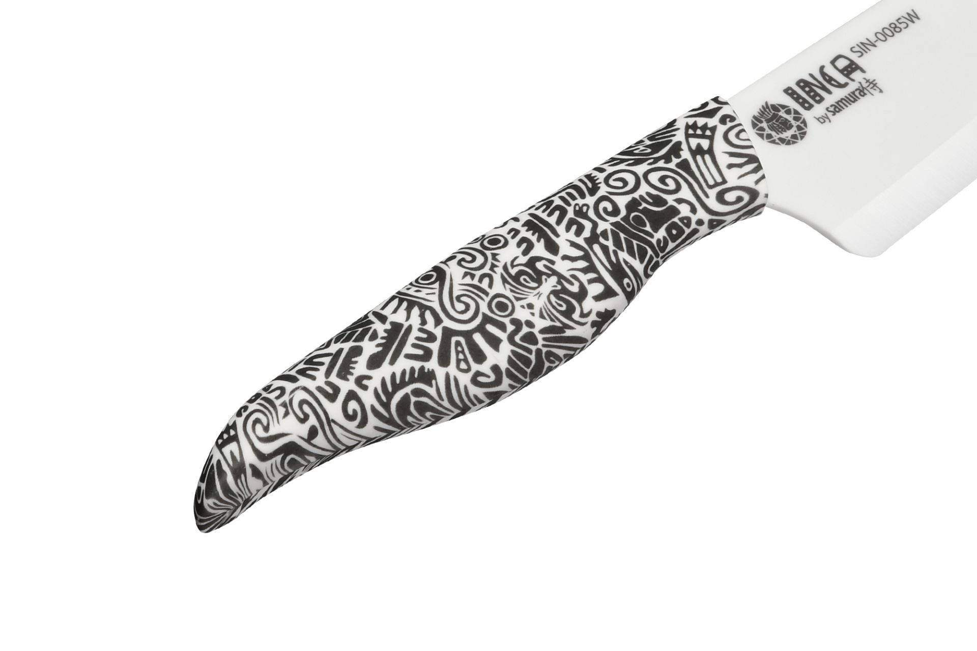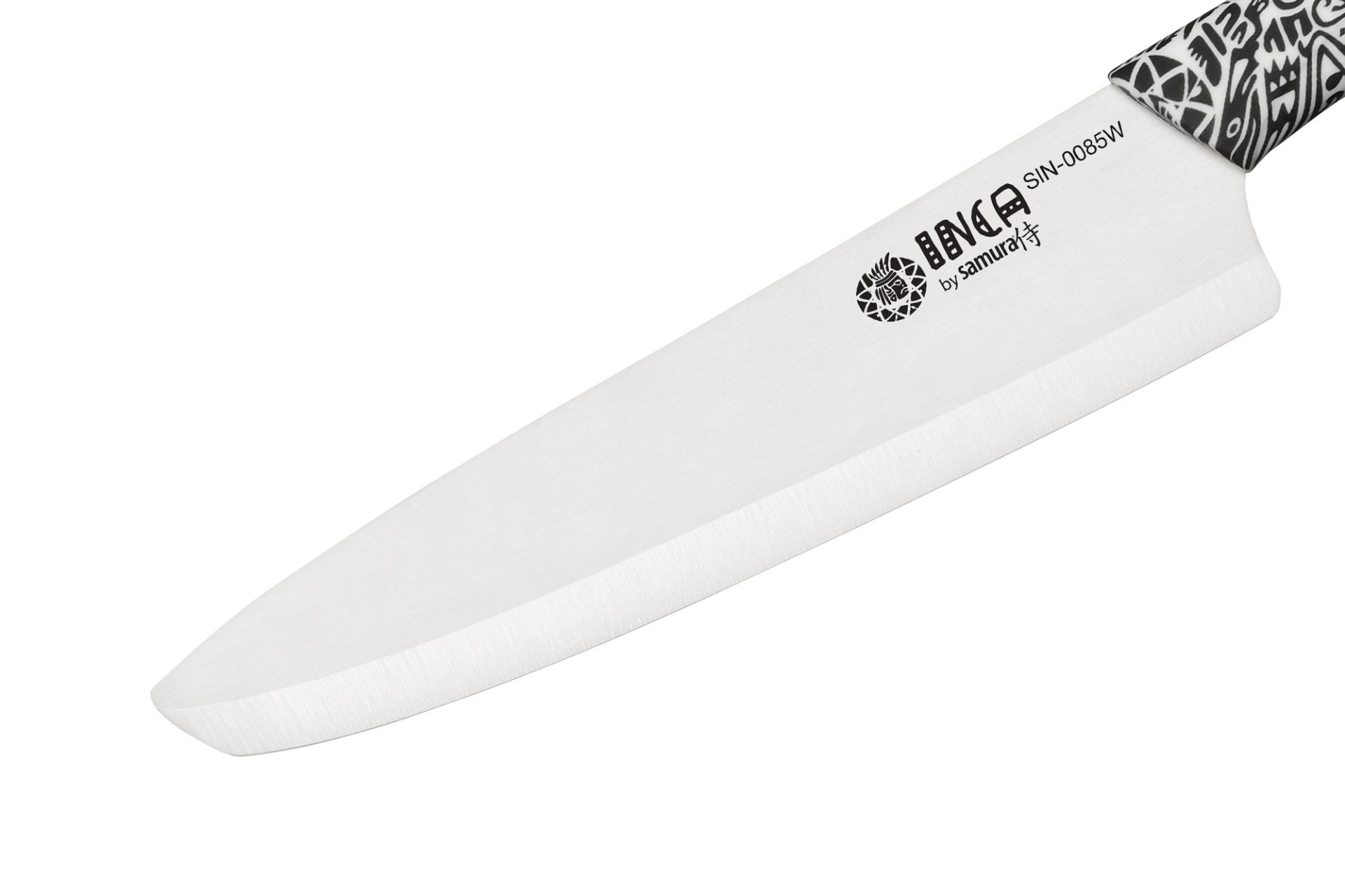 Šéfkuchařský keramický nůž Samura INCA 18,7 cm je oblíbeným kuchyňským nástrojem každého profesionálního kuchaře. Nůž má širokou a dlouhou čepel, vhodnou pro řezání velkých potravin - maso, ryby, zelí, apod. Nůž vyniká extrémně ostrým břitem o tvrdosti 87 HRC. Keramický nůž nevyžaduje broušení. Nůž zůstává ostrý po celou dobu životnosti. Motiv na rukojeti byl inspirován kulturou kmene Inků.