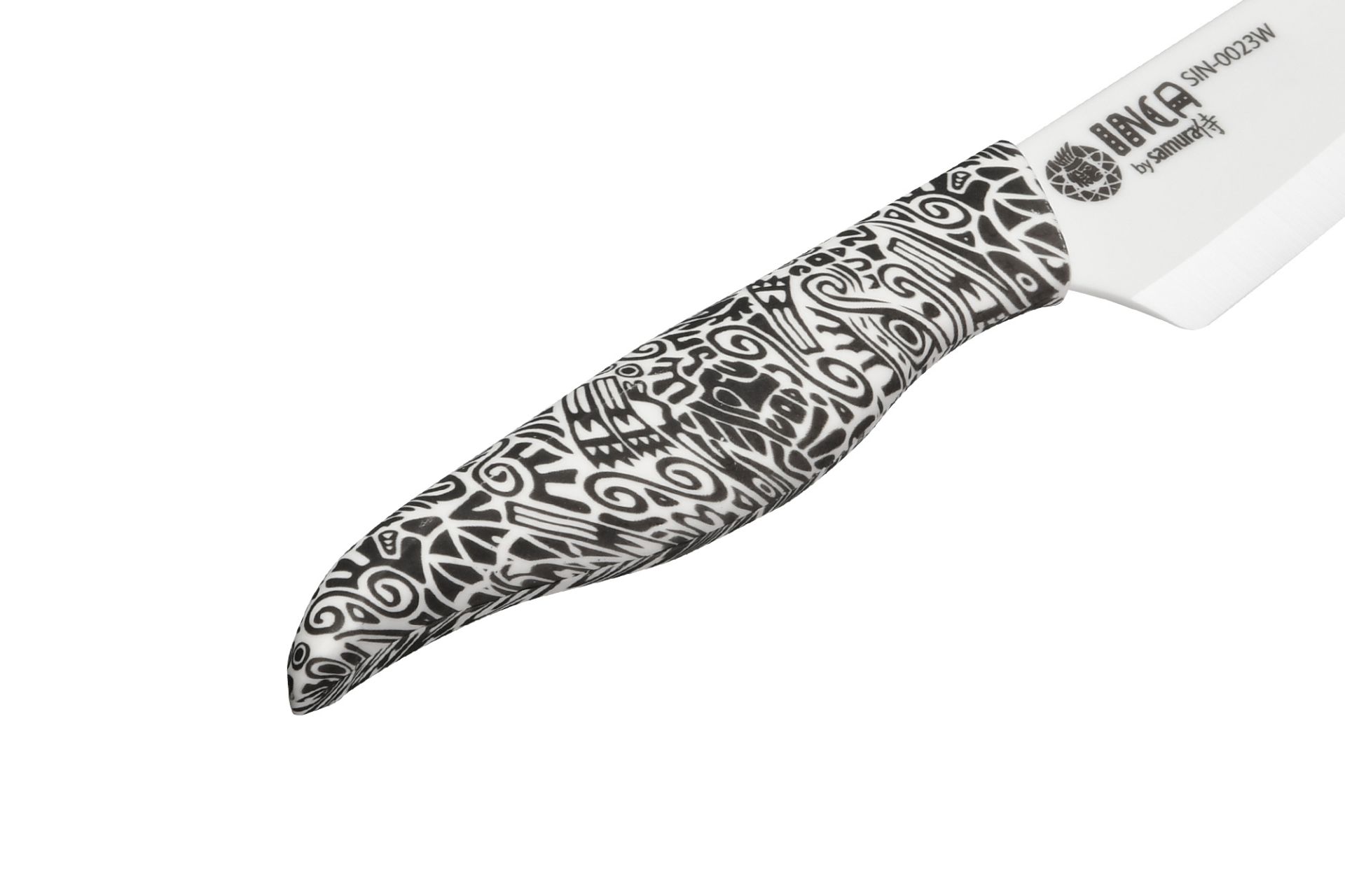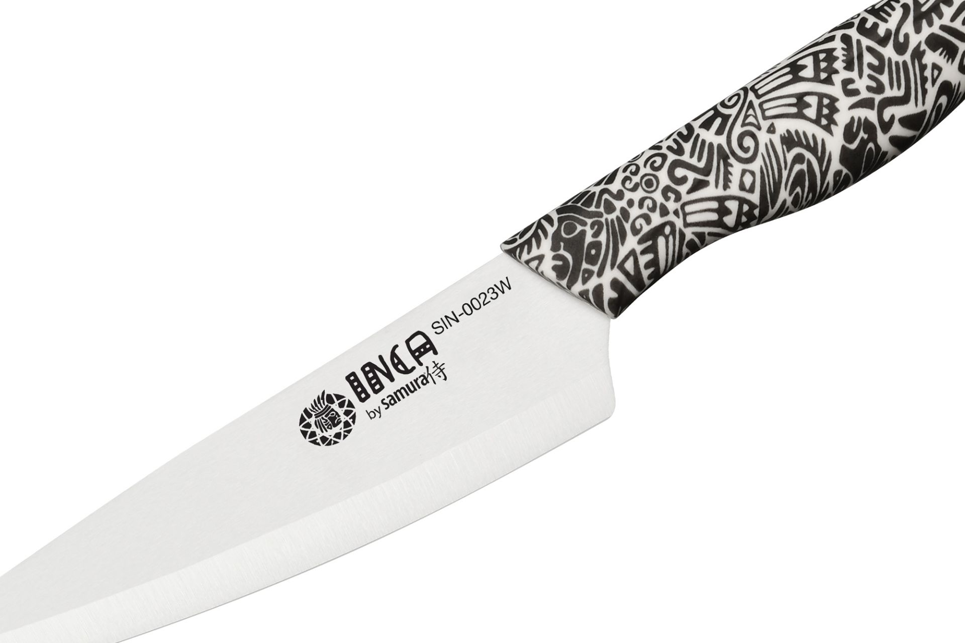 Univerzální keramický nůž Samura INCA 15,5 cm je jeden z nejoblíbenějších nožů pro každodenní vaření. Jeho funkcí je snadná manipulace a schopnost provádět více kuchyňských prací. Používá se k čištění a krájení zeleniny, ovoce, bylinek, sýrů, uzenin, masa. Největší množství kuchyňské práce padne vždy na tento nůž. Nůž vyniká extrémně ostrým břitem o tvrdosti 87 HRC. Keramický nůž nevyžaduje broušení. Nůž zůstává ostrý po celou dobu životnosti. Motiv na rukojeti byl inspirován kulturou kmene Inků.