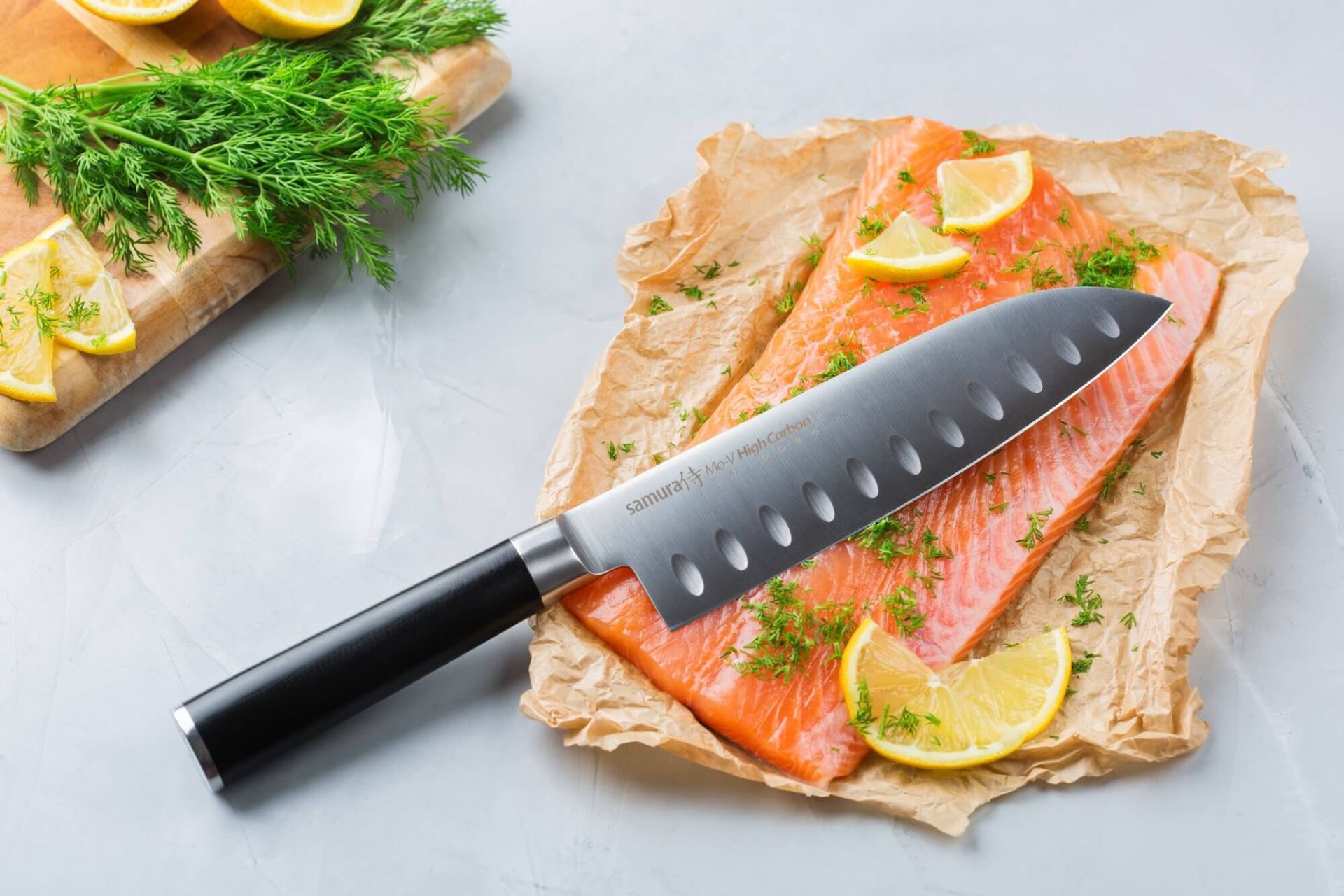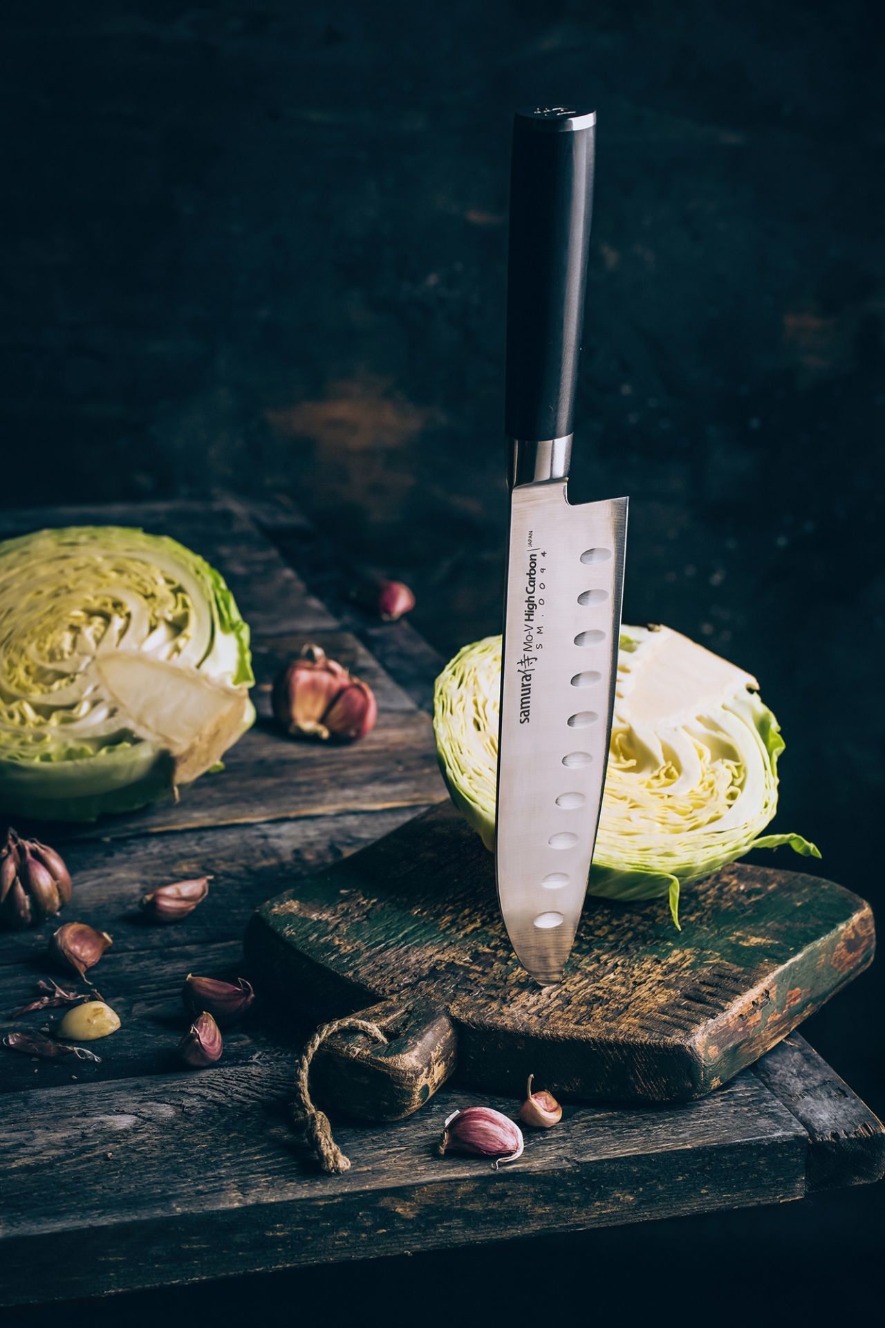 Tento nůž Samura Santoku vyniká tradiční japonskou geometrií - páteř sestupuje ke špičce. Tento tvar nože dohromady s dopředu posunutým těžištěm je ideální pro sekání, drcení a řadu dalších činností. Zvlněné zářezy nad ostřím zabraňují ulpívání potravin na čepeli při práci. Kovová podložka, která plynule přechází do pohodlné rukojeti, zabraňuje kontaktu ruky s jídlem. Japonci toho vědí o pohodlném vaření opravdu hodně a tento nůž je toho zářným příkladem.