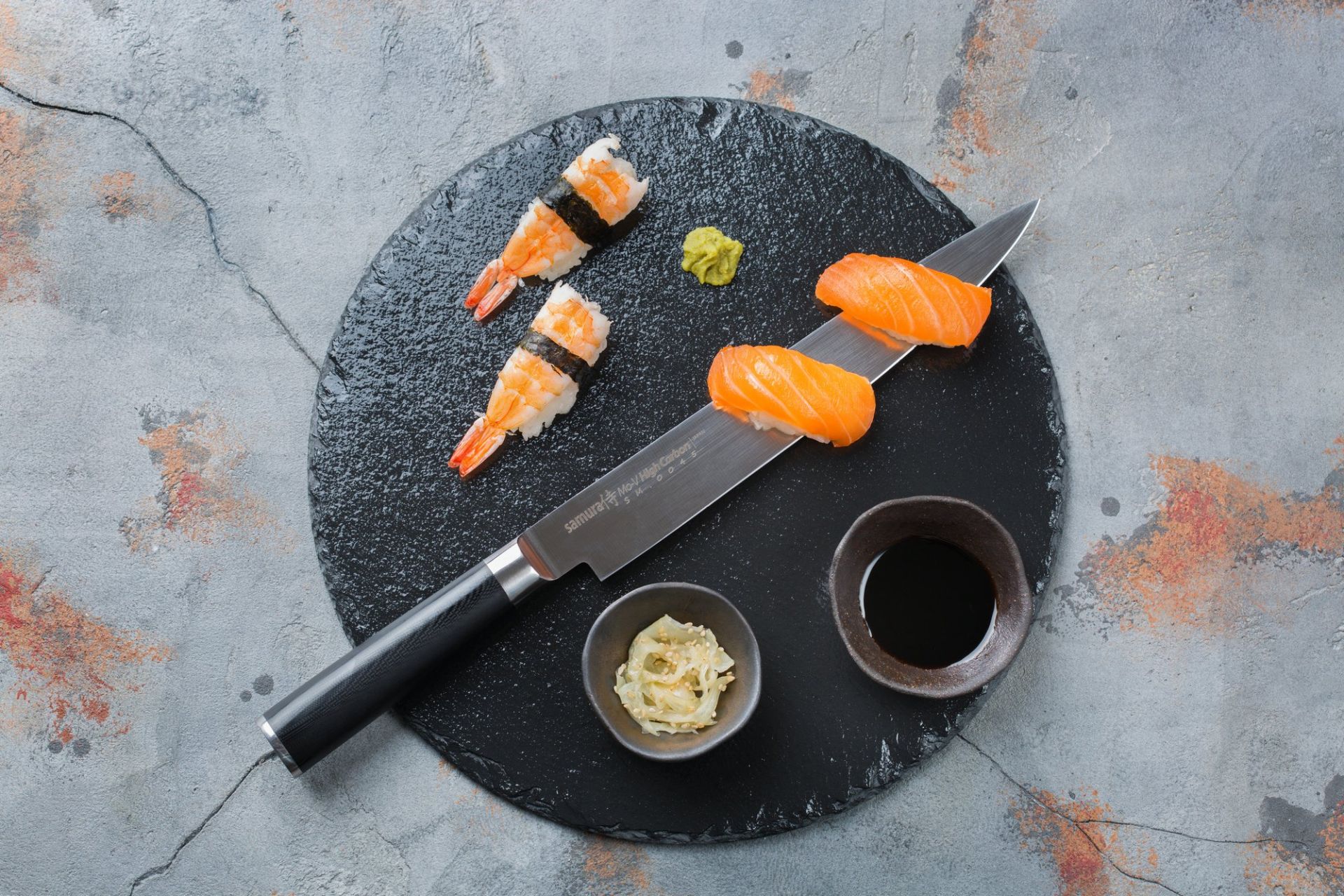 Plátkovací nůž Samura MO-V má úzkou, rovnou a dlouhou (23 cm) čepel, díky čemuž je tento nůž ideální pro porcování pečených nebo vařených žeber, hovězího masa, šunky a krůtího masa, kuřecího masa a ryb. Je nezbytný pro přípravu japonských národních pokrmů, včetně sushi, sashimi a rolek, je také schopen bez námahy oddělit velkou část masa. Jeho oválná čepel se neotáčí v dlani, umožňuje pečlivě kontrolovat proces krájení a snadno manipulovat s nožem.