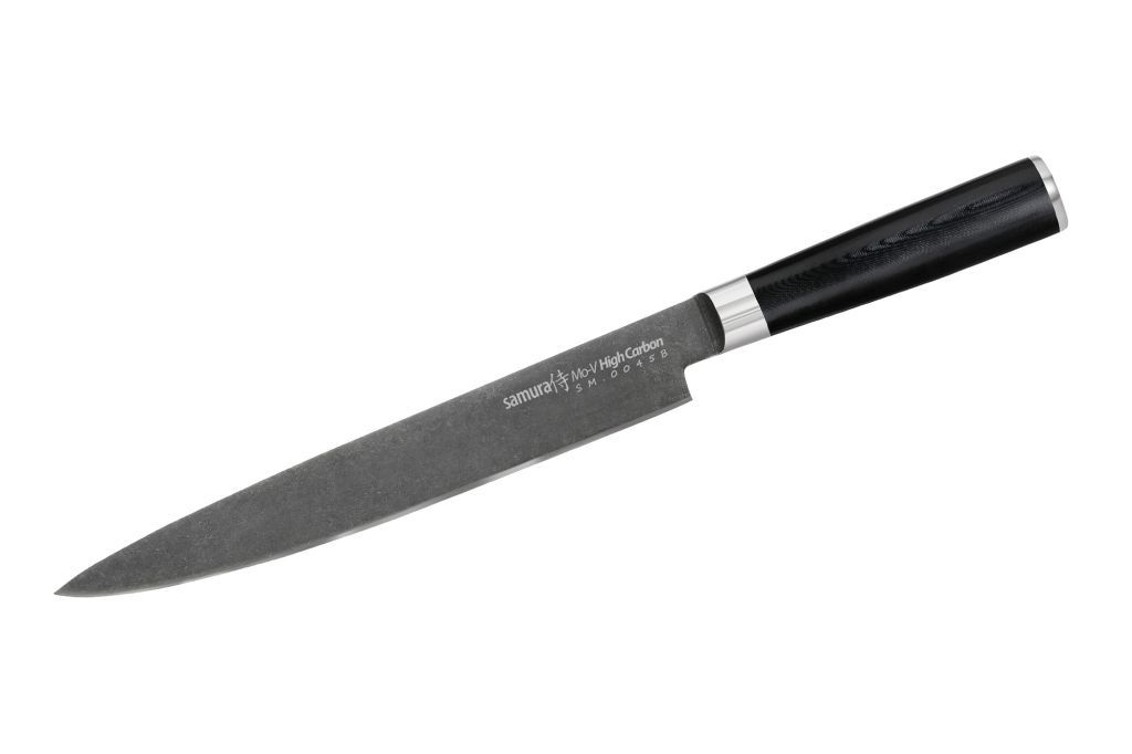 Plátkovací nůž Samura MO-V Stonewash má úzkou, rovnou a dlouhou (23 cm) čepel, díky čemuž je tento nůž ideální pro porcování pečených nebo vařených žeber, hovězího masa, šunky a krůtího masa, kuřecího masa a ryb. Je nezbytný pro přípravu japonských národních pokrmů, včetně sushi, sashimi a rolek, je také schopen bez námahy oddělit velkou část masa. Jeho oválná čepel se neotáčí v dlani, umožňuje pečlivě kontrolovat proces krájení a snadno manipulovat s nožem. Speciální povrchová úprava stonewash propůjčuje čepeli výjimečnou tvrdost a vytváří matný strukturovaný povrch.