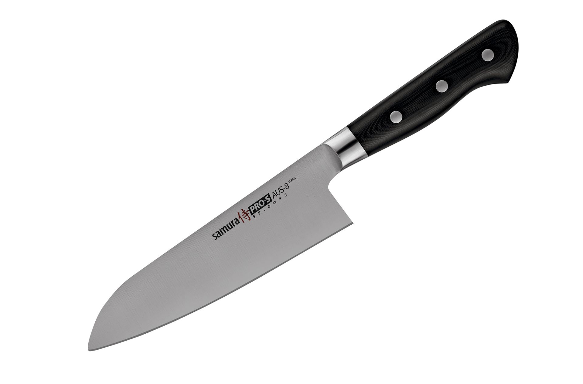 Pro rukojeť používáme nejlepší moderní materiály: Micarta, G10, stabilizované dřevo, plast s jemným povrchem, Kraton a kompozity. Vice o historii zn. Samura. Nůž Santoku PRO-S je japonský šéfkuchařský nůž se špičatou špičkou ostří. Slovo „Santoku“ lze přeložit jako „tři druhy použití“, tj. krájení, řezání a sekání.