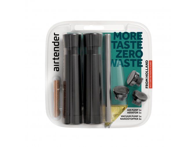 Představujeme vám kompletní sadu pro vakuování vína se vzduchovou pumpou Airtender. S touto sadou připravíte dokonalé víno a koktejly Vydrží déle chutné a svěží. Jedná se o revoluční novinku, která vám přinese dokonalý chuťový požitek například v každé sklence vína.