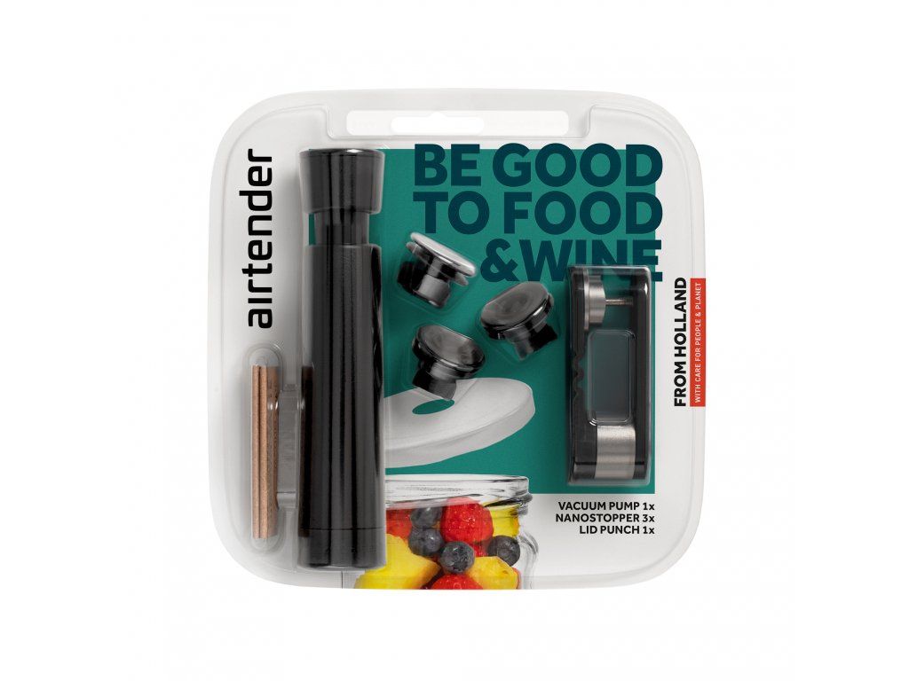 Nabízíme kompletní vakuovací set potravin a vína. Díky této jedinečné vakuové technologii uchováte potraviny a nápoje včetně vína déle čerstvé se stále dokonalou chutí. Ušetříte spoustu námahy, protože manipulace je velmi snadná, práce, času, peněz, místa, jelikož nemusíte kupovat speciální nádoby a také šetříte životní prostředí. Vakuum využijete také k intenzivnějšímu a rychlejšímu marinování, nakládání a louhování. Vyzkoušejte i ostatní sady značky AirTender.