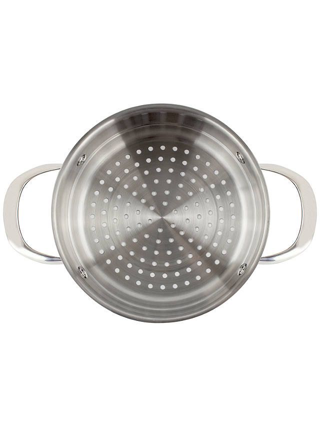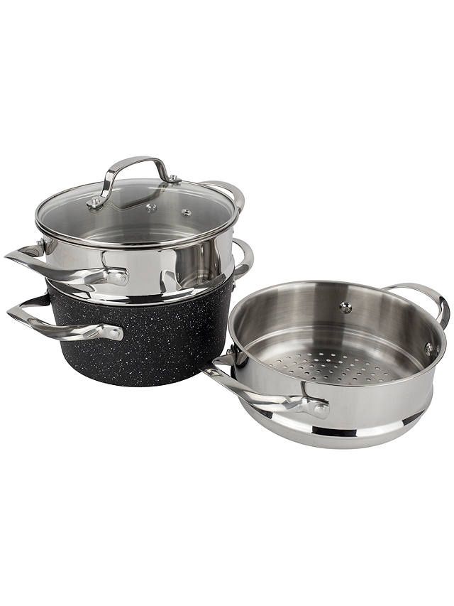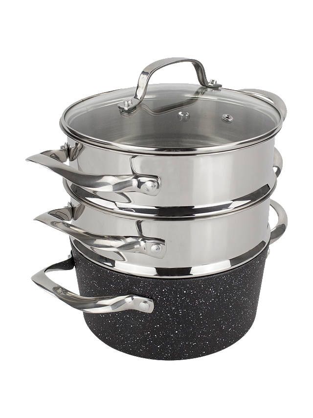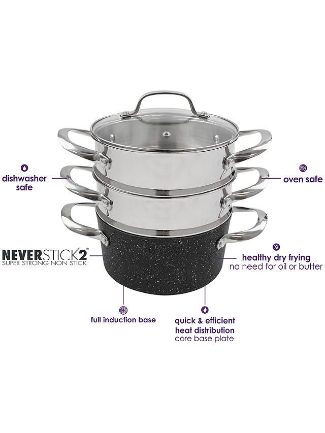 Tato všestranná souprava pro vaření v páře obsahuje nepřilnavý hrnec se dvěma parními vložkami a pokličkou. Hrnec má základnu z vysoce odolného, tvrzeného hliníku a jeho nepřilnavý povrch Neverstick2 zajišťuje snadnější a zdravější vaření.