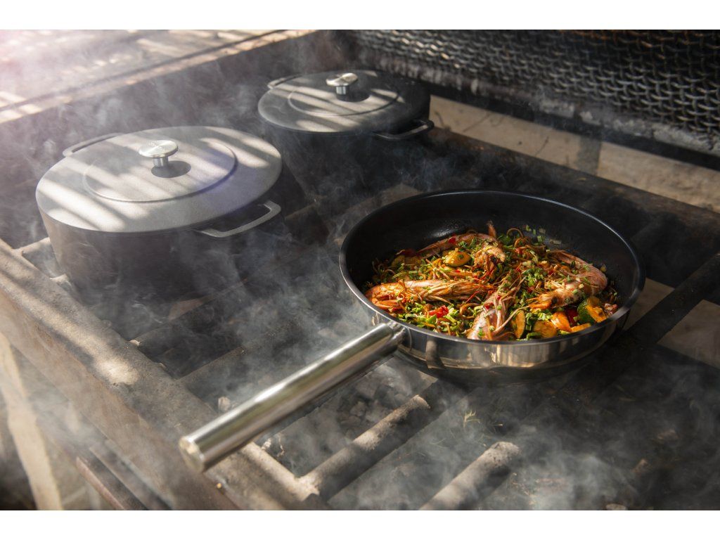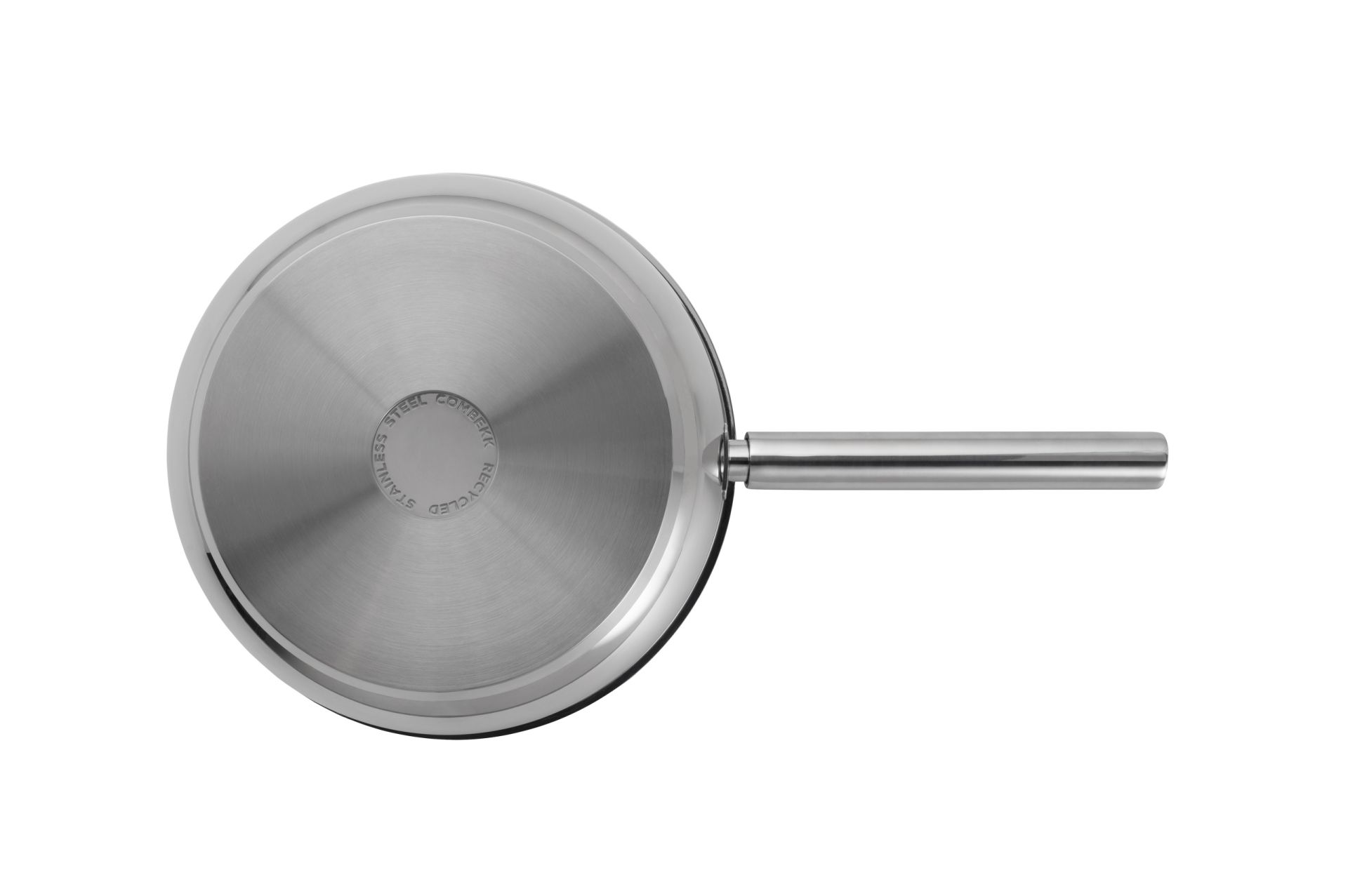 Základem je sendvičové dno o tloušťce 6 mm, vyrobené z 100% recyklované masivní nerezové oceli. To zajišťuje rovnoměrné rozložení tepla a vysokou stabilitu. Třívrstvý design tohoto dna zajišťuje, že plynule sklouzává po povrchu varné desky. Nabízíme vám výběr ze 4 různých velikostí: 20 cm, 24 cm, 28 cm a 32 cm, a samozřejmě nemůže chybět ani vysoká pánev (wok). Ať už máte jakýkoli typ varné desky, včetně indukčních, tato pánev je pro vás skvělou volbou. Výroba tohoto nádobí z 100% recyklované nerezové oceli a 100% recyklovaného keramického povrchu podtrhuje naši angažovanost vůči udržitelnosti. Pochází z Nizozemska, země s bohatou tradicí kvalitního zpracování kovů.