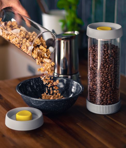 Vakuové nádoby jsou vyrobené z vysoce kvalitního skla, což zaručuje bezpečné skladování potravin a zároveň dodává estetický vzhled.