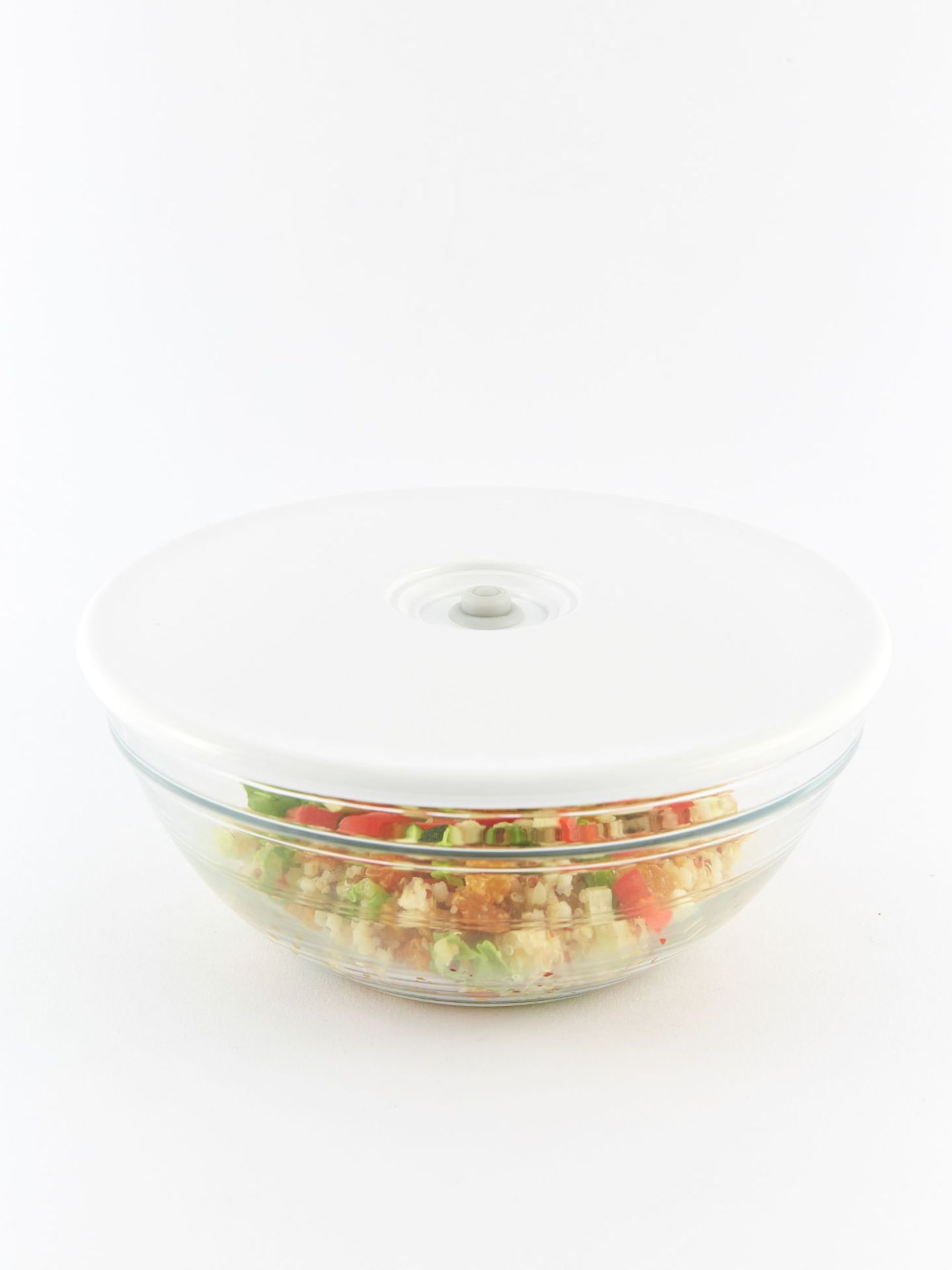 S touto univerzální vakuovou poklicí o průměru 21 cm dokážete uchovat potraviny až pětkrát déle, přičemž si zachovají svou chuť a všechny živiny. Je kompatibilní s vakuovou pumpou zahrnutou ve startovací sadě.