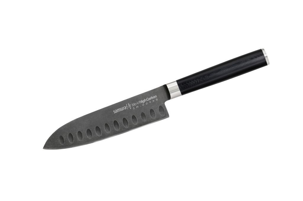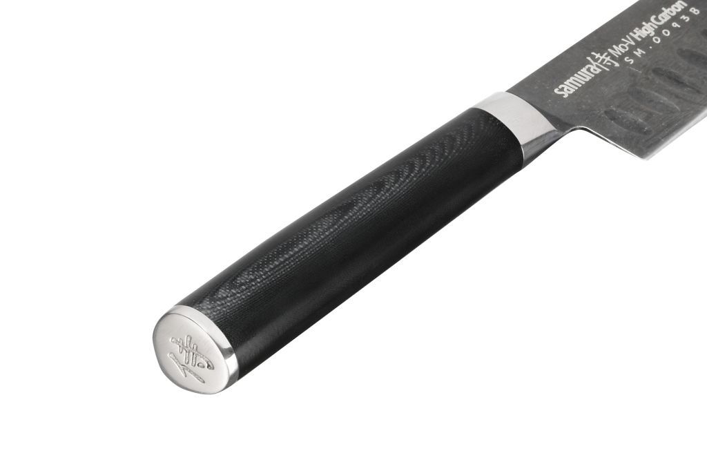 Tento nůž Samura Santoku vyniká tradiční japonskou geometrií - páteř sestupuje ke špičce. Tento tvar nože dohromady s dopředu posunutým těžištěm je ideální pro sekání, drcení a řadu dalších činností. Zvlněné zářezy nad ostřím zabraňují ulpívání potravin na čepeli při práci. Kovová podložka, která plynule přechází do pohodlné rukojeti, zabraňuje kontaktu ruky s jídlem. Japonci toho vědí o pohodlném vaření opravdu hodně a tento nůž je toho zářným příkladem. Speciální povrchová úprava stonewash propůjčuje čepeli výjimečnou tvrdost a vytváří matný strukturovaný povrch.