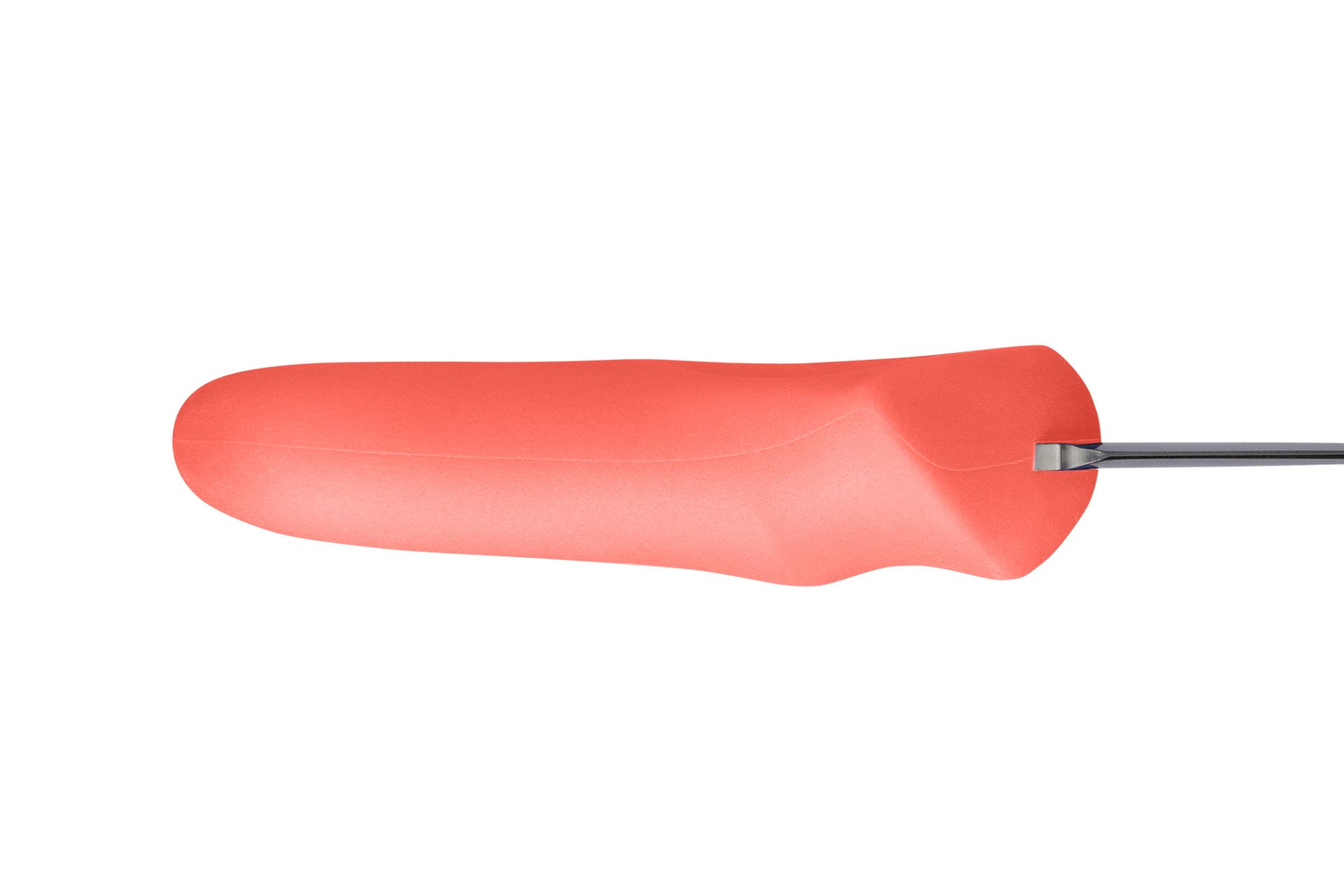 Rukojeť z TPE, termoplastického elastomeru, nabízí měkký a pohodlný úchop. Ergonomicky tvarovaná s protiskluzovou texturou, zajišťuje bezpečné držení nože, i když je rukojeť mokrá nebo mastná, což výrazně zvyšuje bezpečnost při používání.