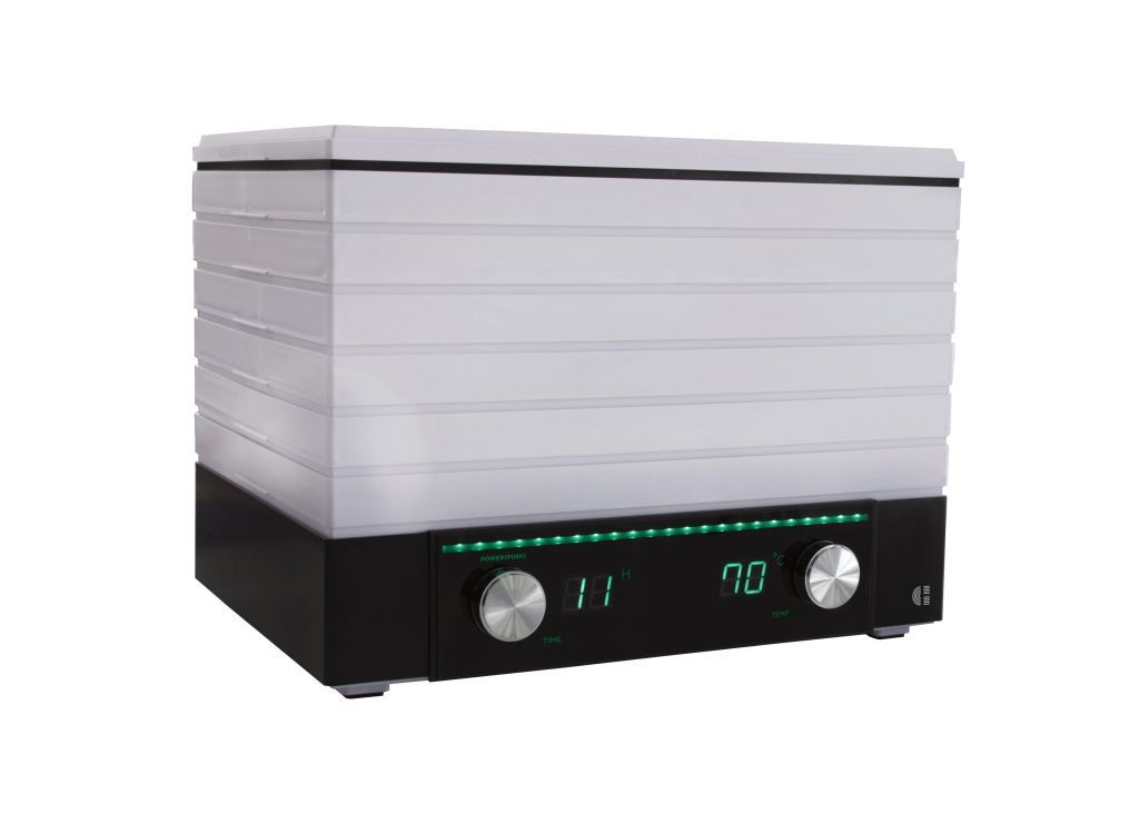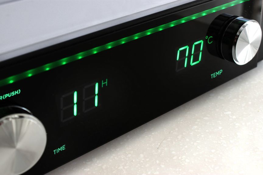 Teplotu sušení jednoduše nastavíte pomocí otočného ovladače na pravé straně, kde se také nachází digitální display. Na levé straně se nachází ovladač času také s displayem. Správně nastavená teplota je důležitá pro zachování všech důležitých vitamínů a minerálů. Tento model je samozřejmě vhodný i pro přípravu raw potravin. V sušičce je možné sušit již při mírných teplotách a ztráta živin a enzymů přítomných v potravinách je max 4%.