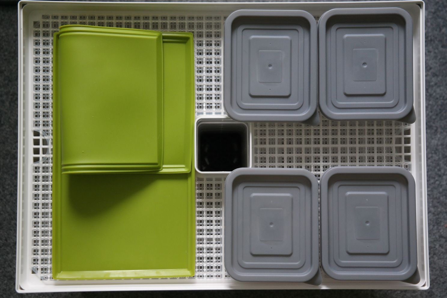 - 6 tácy, které jsou opatřeny vkládacími síťkami. Síťky zabraňují tomu, aby malé kousky ovoce a zeleniny propadly otvory sušících táců,