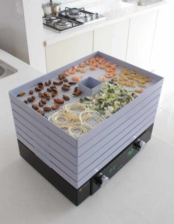 Raw sušení: Optimální teplota pro zachování enzymů je v rozmezí 45°C - 48°C. Sušička má moderní základnu s topným tělesem, ventilátorem a ovládáním pro přesné řízení teploty i délky sušení. Jedinečné Airfiltry zabraňují prachu a nečistotám dostat se k dehydrovaným surovinám. Proces sušení je poměrně nenáročný a není nutné být neustále u sušičky. Dehydratace může být prováděna i přes noc, díky velmi tichému chodu. Sušička je BPA free.